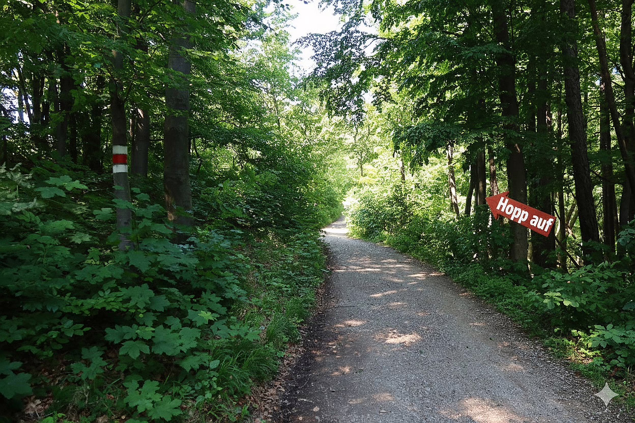 Bild 4: Wenige Meter noch, dann haben wir die Jägerwiese erreicht. Jetzt nur nicht nach links abbiegen. Einfach geradeaus.