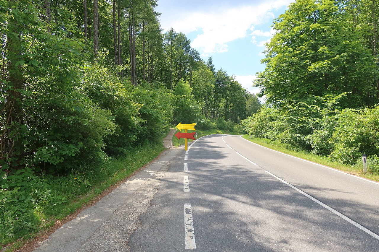 Bild 9: Nach der Wiese sind wir ein Stück durch lichten Wald marschiert und erreichen die Zufahrtsstraße zur Sophienalpe. Hier müssen wir unbedingt links abbiegen.