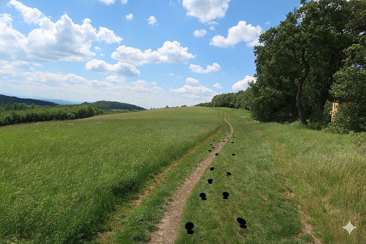 Bild 7: Natürlich finden wir auf dieser Wiese keine Markierung, aber erkennbar ist der Weg trotzdem.