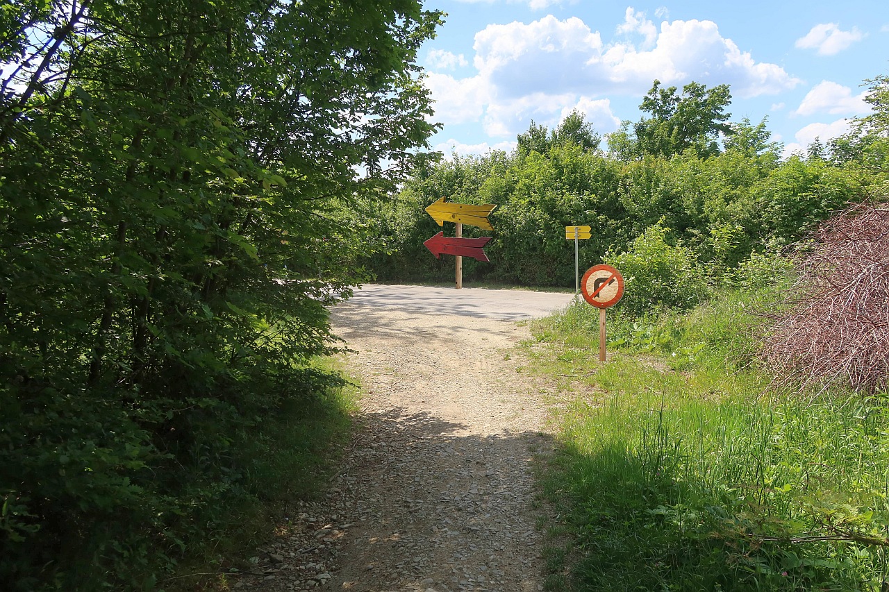 Bild 2: Bald nach der Gipfelwiese kommen wir zu diesem Abzweiger. Eigentlich wäre es egal, für welchen Weg man sich entscheidet. Aber wir haben uns entschieden, dass man rechts gehen soll. Der roten Markierung folgen wir ab jetzt.