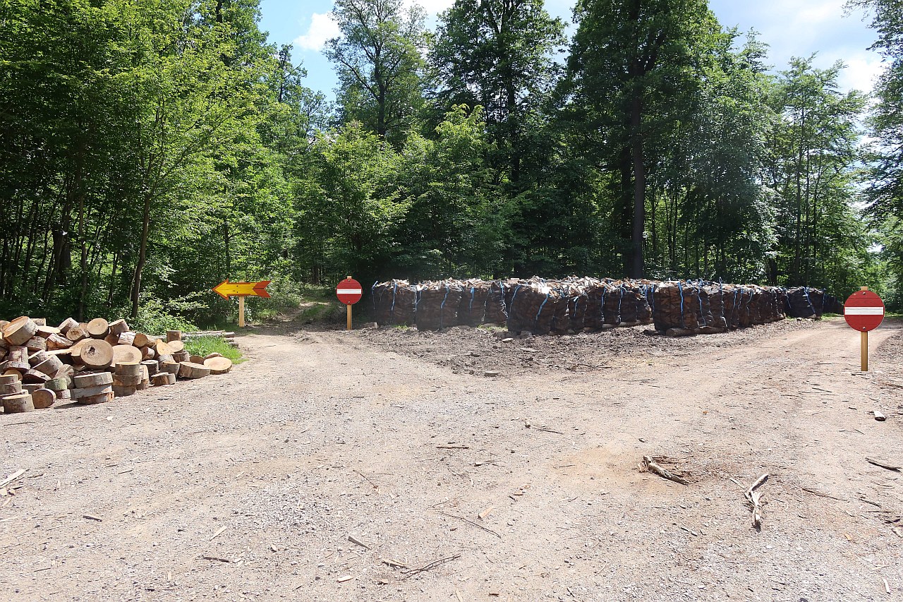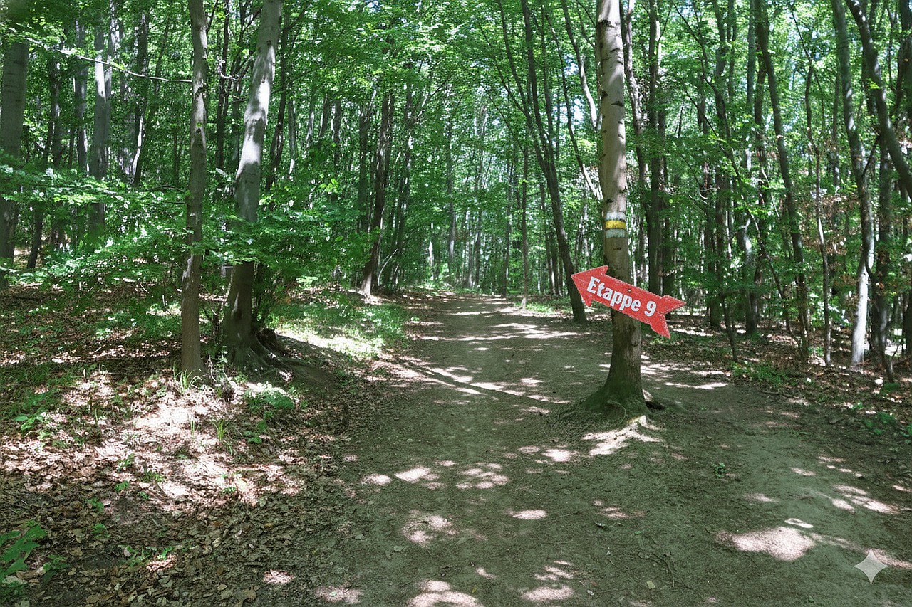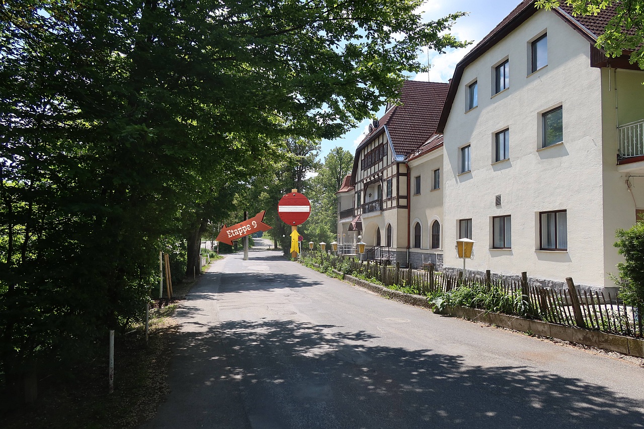 Vorletztes Teilstück. Wir haben uns für die Etappe entschieden, welche uns zum Schottenhof führen wird. Von den Schleifern müssen wir uns hier verabschieden. Die gehen gerade weiter nach Vorderhainbach. Gegnüber vom ehemaligen Haupteingang des Gebäudes leitet ein schmaler Pfad in den Wald hinein. Ein Wegweiser zeigt uns "Stadtwanderweg 8". Da wandern wir hinunter.