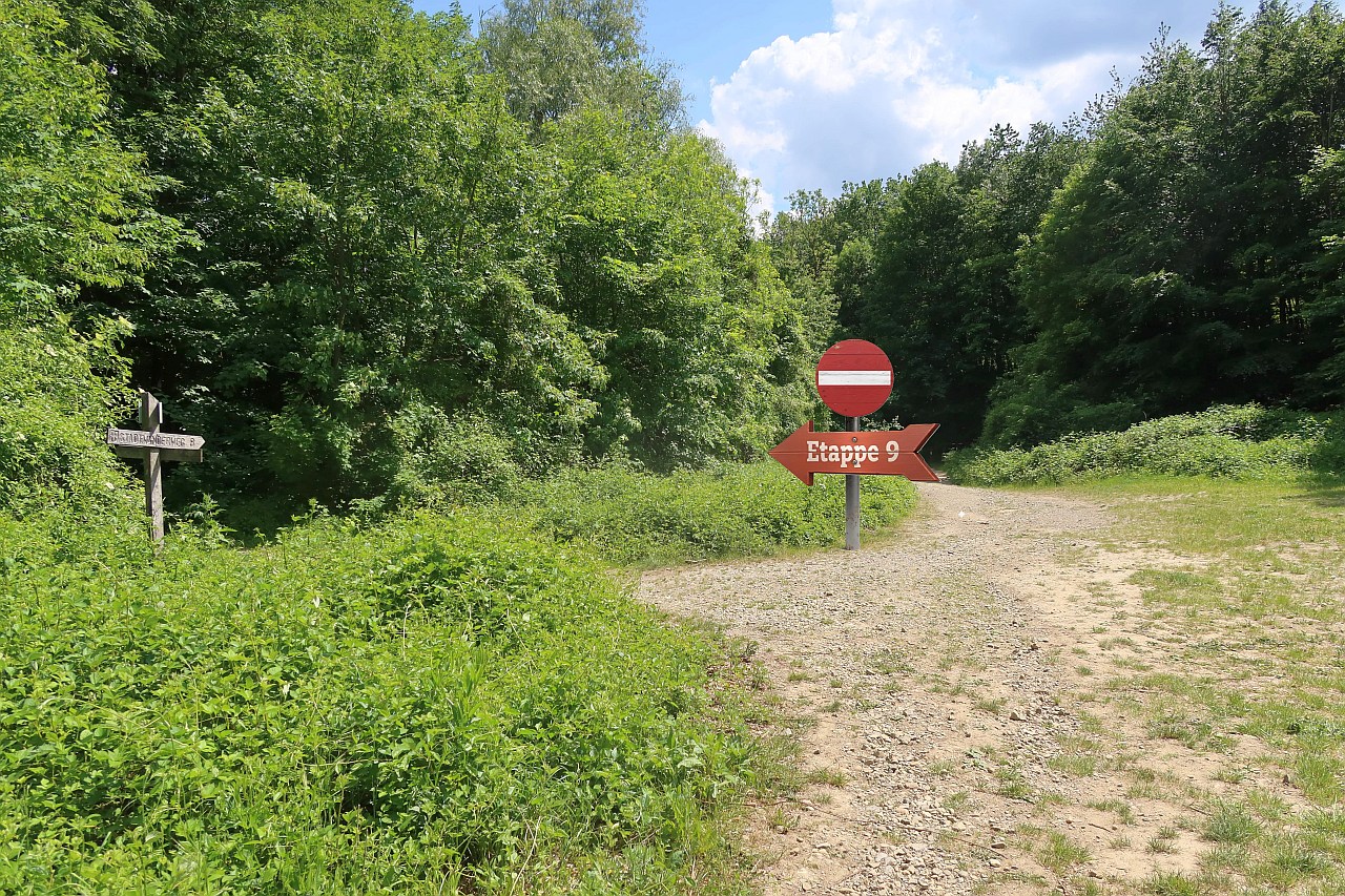 Bild 6: Schon bald erreichen wir den nächsten Abzweiger. Hier biegen wir nach links ab. Sollten uns vom rechten Weg Wanderer entgegekommen, könnten das welche sein, die die Schleife 9 erwandern. Denn ab hier marschieren wir gemeinsam zum Schottenhof.