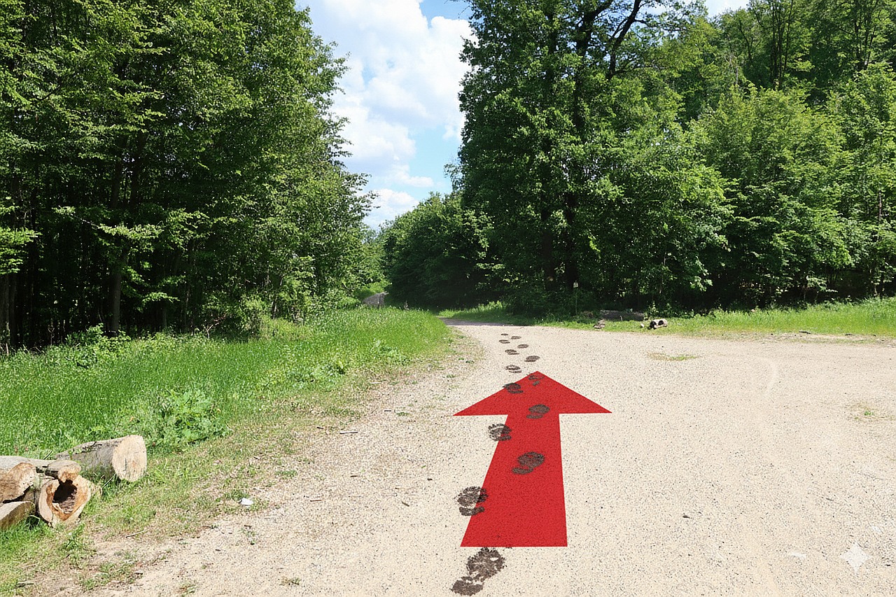 Bild 8: Hier nun das schmale Wegerl in den Wald hinein. Der andere Weg ist eine Falle, in die wir nicht tappen.