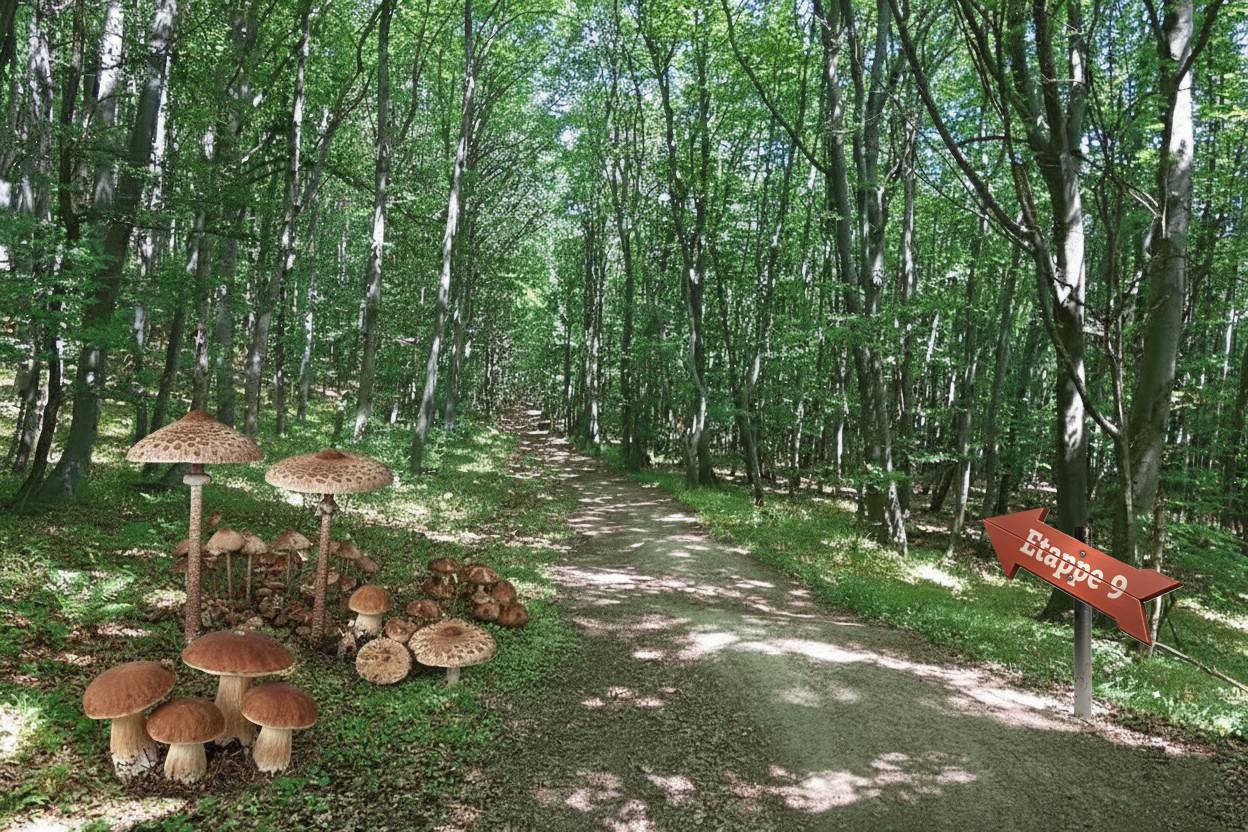 Vorletztes Teilstück. Wir haben uns für die Etappe entschieden, welche uns zum Schottenhof führen wird. Von den Schleifern müssen wir uns hier verabschieden. Die gehen gerade weiter nach Vorderhainbach. Gegnüber vom ehemaligen Haupteingang des Gebäudes leitet ein schmaler Pfad in den Wald hinein. Ein Wegweiser zeigt uns "Stadtwanderweg 8". Da wandern wir hinunter.