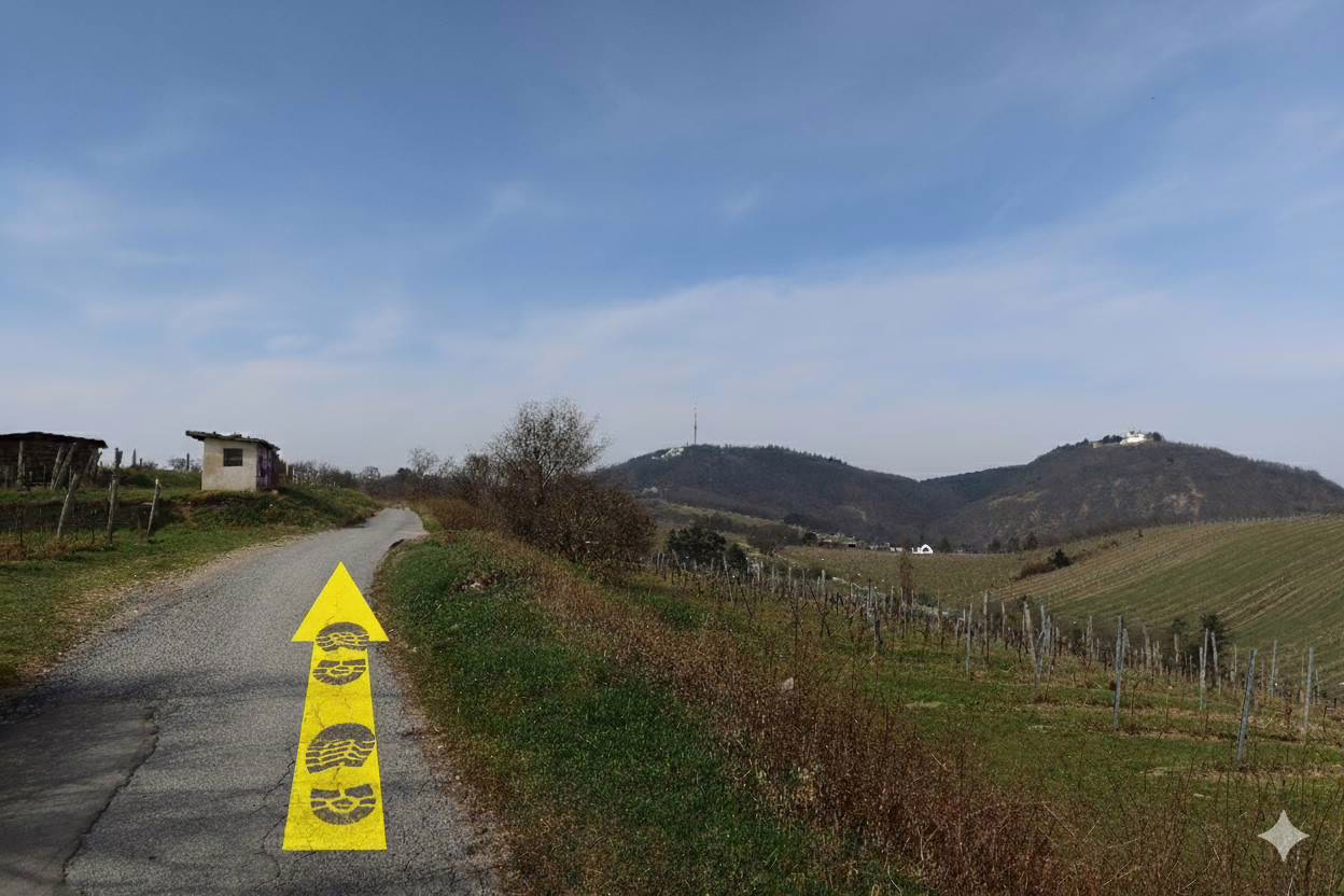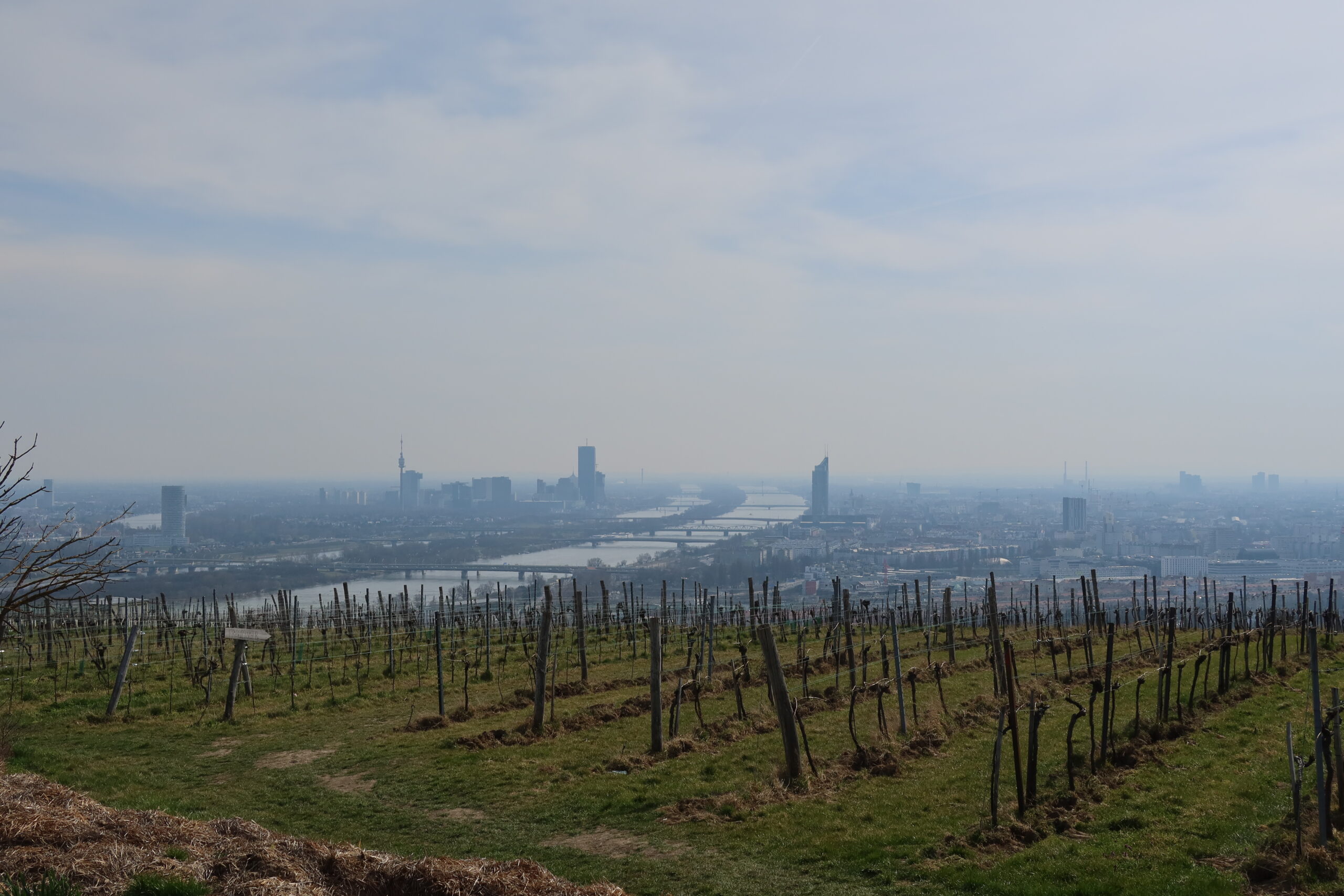 Bild 12: Wir erkennen rechts im Hintergrund das Ziel von Etappe 2 und Schleife 2, den Kahlenberg. Über den rechten Berg, den Leopoldsberg müssen wir ebenfalls bei beiden Varianten drüber. Dies ist von den Etappen die „Königsetappe.“ Aber noch ist es nicht so weit. Wir bleiben noch immer im Weingarten.