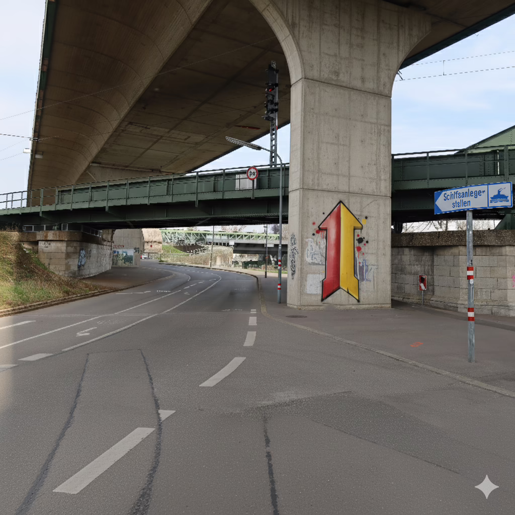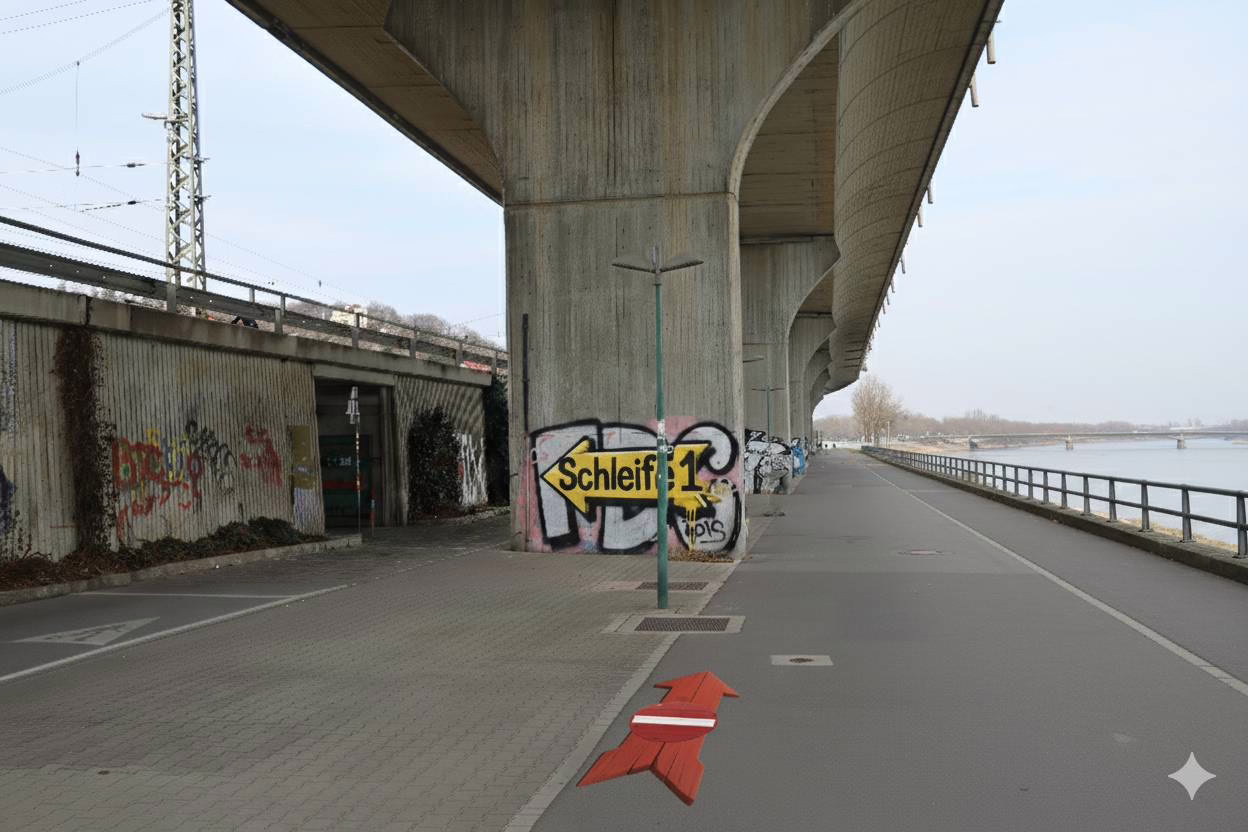 Bild 1: Wir verspüren erstmals den Duft der Donau. Sehen können wir sie aber noch nicht. Wir haben soeben die Unterführung durchschritten, biegen dahinter links ab und halten uns am besten entlang des Radweges, indem wir dem Hinweisschild „Schiffsanlegestelle“ folgen. Die eingeschlagene Richtung unter den beiden Brücken scheint zwar verwirrend, ist aber richtig.