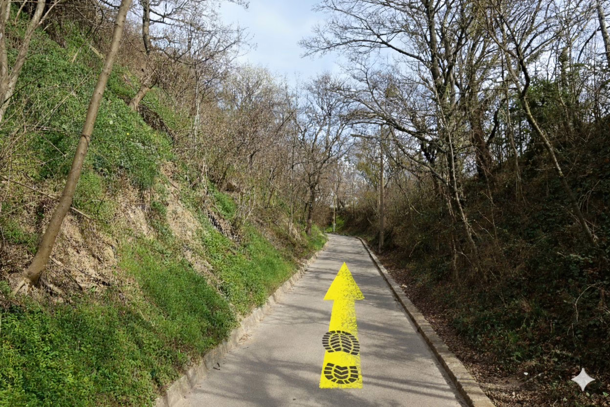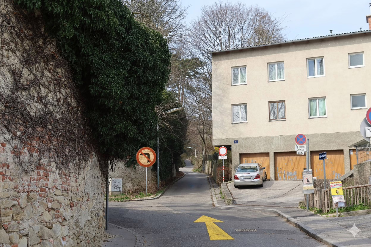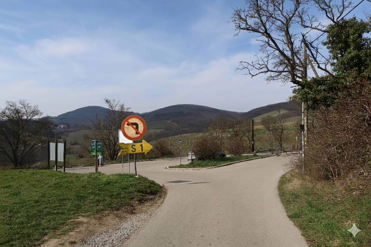 Bild 8: Wir haben den Kulminationspunkt des Nußberges überschritten. Bei dieser Verkehrsinsel mündet der Eichelhofweg in die Kahlenberger Straße ein. Wir halten uns ganz strikt rechts.