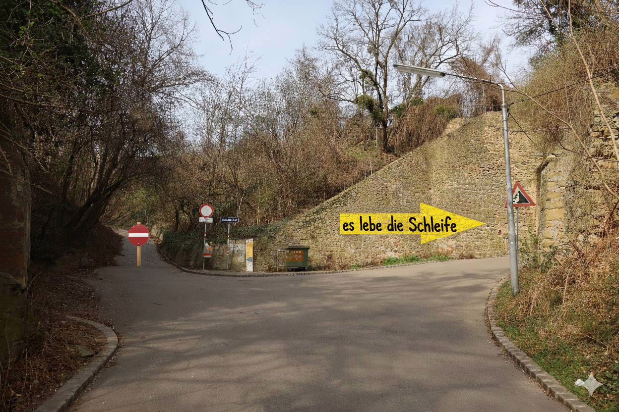 Bild 1: Jetzt nur nicht täuschen lassen. Die kleine Gasse geradeaus schaut verführerisch zum Erwandern aus, aber die Eichelhofstraße biegt rechts ab. Und auf der bleiben wir noch.
